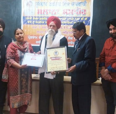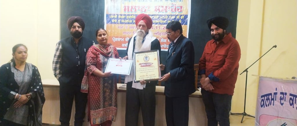 ਗੁਰਦਾਸਪੁਰ 29 ਨਵੰਬਰ (ਜਸਪਾਲ ਚੰਦਨ) ਕਲਮਾਂ ਦਾ ਕਾਫ਼ਲਾ ਸਾਹਿਤਕ ਗਰੁੱਪ ਦੇ ਸੰਸਥਾਪਕ ਭੈਣ ਜੀ ਗੁਰਜੀਤ ਕੌਰ ਅਜਨਾਲਾ ਵੱਲੋਂ ਆਪਣੇ ਪਿਤਾ ਸੂਬੇਦਾਰ ਬਲਕਾਰ ਸਿੰਘ ਦੀ ਨਿੱਘੀ ਯਾਦ ਨੂੰ ਸਮਰਪਿਤ ਕਵੀ ਦਰਬਾਰ ਤੇ ਪੁਸਤਕ ਲੋਕ -ਅਰਪਣ ਸਮਾਗਮ ਵਿਰਸਾ ਵਿਹਾਰ ਅੰਮ੍ਰਿਤਸਰ ਵਿੱਚ ਕਰਵਾਇਆ ਗਿਆ। ਪ੍ਰੋਗਰਾਮ ਵਿੱਚ ਕਲਮਾਂ ਦਾ ਕਾਫ਼ਲਾ ਗਰੁੱਪ ਵੱਲੋ ਛਾਪੇ ਗਏ ਚਾਰਸਾਂਝੇ ਕਾਵਿ ਸੰਗ੍ਰਹਿ ਇੱਕ ਵਾਰਤਕ ਸੰਗ੍ਰਹਿ ਤੇ ਇੱਕ ਮਿੰਨੀ ਕਹਾਣੀ ਸੰਗ੍ਰਹਿ ਲੋਕ ਅਰਪਣ ਕੀਤਾ ਗਿਆ। ਪ੍ਰੋਗਰਾਮ ਵਿੱਚ ਵੱਖ ਵੱਖ ਜ਼ਿਲ੍ਹਿਆਂ ਤੇ ਦੇਸ਼ ਦੇ ਵੱਖ ਵੱਖ ਕੋਨਿਆਂ ਤੋਂ ਆਏ ਲੇਖਕਾਂ ਤੇ ਕਵੀਆਂ ਨੇ ਹਾਜ਼ਰੀ ਭਰੀ।ਪ੍ਰਧਾਨਗੀ ਮੰਡਲ ਵਿੱਚ ਸ਼ੈਲਿੰਦਰਜੀਤ ਰਾਜਨ ਪ੍ਰਧਾਨ ਬਾਬਾ ਬਕਾਲਾ ਸਾਹਿਬ ਸਭਾ, ਗੁਰਚਰਨ ਗਾਂਧੀ ਮੁਖ ਸੰਪਾਦਕ ਮੈਗਜ਼ੀਨ ਸੂਹੀ ਸਵੇਰ,ਮਲਕੀਤ ਪਾਪੀ ਜੀ, ਰਛਪਾਲ ਸਿੰਘ ਬਾਗ਼ੀ ਬਾਬਾ ਦੀਪ ਸਿੰਘ ਸੇਵਾ ਸੁਸਾਇਟੀ ਚੀਫ ਖਾਲਸਾ ਦੀਵਾਨ, ਭੁਪਿੰਦਰ ਸਿੰਘ ਸੰਧੂ ਪ੍ਰਧਾਨ ਆਲਮੀ ਪੰਜਾਬੀ ਵਿਰਾਸਤ ਵਿਰਸਾ ਵਿਹਾਰ, ਮਨਪ੍ਰੀਤ ਕੌਰ ਸੰਧੂ, ਗੁਰਜੀਤ ਕੌਰ ਅਜਨਾਲਾ ਮੌਜੂਦ ਸਨ। ਪ੍ਰੋਗਰਾਮ ਵਿੱਚ ਵੱਖ ਵੱਖ ਕਵੀਆਂ ਦੁਆਰਾ ਆਪਣੀਆਂ ਰਚਨਾਵਾਂ ਸਾਂਝੀਆਂ ਕੀਤੀਆਂ ਗਈਆਂ। ਜਿਹਨਾਂ ਵਿੱਚ ਜਸਵੰਤ ਧਾਪ,ਅਨਵਰ ਖਾਨ ਹਥਨ ਮਲੇਰਕੋਟਲਾ, ਮਨਪ੍ਰੀਤ ਕੌਰ ਲੁਧਿਆਣਾ,ਸੁਰਜੀਤ ਕੌਰ ਭੋਗਪੁਰ, ਰਾਜਵਿੰਦਰ ਕੌਰ ਭੌਗਪੁਰ, ਅਮਨਜੀਤ ਕੌਰ ਜਲੰਧਰ,ਮਮਤਾ ਅਤਰੀ ਪਠਾਨਕੋਟ, ਕੁਲਭੂਸ਼ਨ ਸਲੋਤਰਾ ਕਾਦੀਆਂ,ਸੁਖਦੇਵ ਸਿੰਘ ਗੰਢਵਾ ਫਗਵਾੜਾ, ਮਨਪ੍ਰੀਤ ਕੌਰ ਮੁੰਬਈ, ਮਨਪ੍ਰੀਤ ਕੌਰ ਮੱਟੂ ਰੱਈਆ, ਅਮਨਜੀਤ ਕੌਰ ਬਟਾਲਾ, ਪ੍ਰਿੰਸੀਪਲ ਸੁਬੀਰ ਸਿੰਘ ਨੂਰ, ਜਤਿੰਦਰ ਕੌਰ,ਮੱਖਣ ਸਿੰਘ ਭੈਣੀ ,ਬਲਜੀਤ ਕੌਰ ਲਧਿਆਣਵੀ,ਰਮਨਜੋਤ ਬਰਾੜ ਫ਼ਿਰੋਜ਼ਪੁਰ ਸਤਨਾਮ ਕੌਰ ਤੁਗਲਵਾਲਾ,ਰਜਨੀ ਤਰਨਤਾਰਨ,ਜਤਿੰਦਰ ਕੌਰ ਅਮ੍ਰਿਤਸਰ , ਗੁਰਚਰਨ ਗਾਂਧੀ ਆਦਿ ਪ੍ਰਮੁੱਖ ਸਨ। ਪ੍ਰੋਗਰਾਮ ਵਿੱਚ ਬਾਲ ਕਾਵਿ ਸੰਗ੍ਰਹਿ ਨਿੱਕੀਆ ਪੈੜਾਂ,ਵਾਰਤਕ ਸੰਗ੍ਰਹਿ ਯਾਦਾਂ ਦੀ ਫੁਲਕਾਰੀ,ਕਵਿਤਾ ਸੰਗ੍ਰਹਿ ਹਰਫ਼ਾਂ ਦੀ ਡਾਰ, ਕਲਮਾਂ ਦੀ ਸੱਥ, ਹਰਫ਼ਾਂ ਦੀ ਡੋਰ,ਮਿੰਨੀ ਕਹਾਣੀ ਸੰਗ੍ਰਹਿ ਬੂੰਦ ਬੂੰਦ ਸਾਗਰ ਲੋਕ ਅਰਪਣ ਕੀਤਾ ਗਿਆ।ਇਸ ਤੋਂ ਇਲਾਵਾ ਕਵੀ ਕੁਲਭੂਸ਼ਨ ਸਲੋਤਰਾ ਦਾ ਕਾਵਿ ਸੰਗ੍ਰਹਿ ਮੂੰਹ ਦੀ ਬੁਰਕੀ ਦੀ ਘੁੰਡ ਚੁਕਾਈ ਵੀ ਕੀਤੀ ਗਈ। ਮਲਕੀਤ ਸਿੰਘ ਪਾਪੀ ਜੀ ਨੂੰ ਸੂਬੇਦਾਰ ਬਲਕਾਰ ਸਿੰਘ ਯਾਦਗਾਰੀ ਐਵਾਰਡ ਨਾਲ ਸਨਮਾਨਿਤ ਕੀਤਾ ਗਿਆ। ਪ੍ਰਬੰਧਕੀ ਟੀਮ ਵੱਲੋਂ ਆਏ ਮਹਿਮਾਨਾਂ ਦਾ ਧੰਨਵਾਦ ਕੀਤਾ ਗਿਆ।ਮੰਚ। ਸੰਚਾਲਨ ਦੀ ਜ਼ਿੰਮੇਵਾਰੀ ਨੂੰ ਮੈਣ ਰਿੱਤੂ ਵੱਲੋਂ ਬਾਖੂਬੀ ਨਿਭਾਇਆ ਗਿਆ।ਪ੍ਰੋਗਰਾਮ ਆਪਣੇ ਪੂਰਵ ਨਿਰਧਾਰਤ ਸਮੇਂ ਅਨੁਸਾਰ ਨਿਰਵਿਘਨ ਸਮਾਪਤ ਹੋਇਆ। ਕਲਮਾਂ ਦਾ ਕਾਫ਼ਲਾ ਗਰੁੱਪ ਦੀ ਸਮੁੱਚੀ ਟੀਮ ਤੇ ਸ਼ਾਮਲ ਕਲਮਕਾਰਾਂ ਨੂੰ ਸ਼ਾਨਦਾਰ ਪ੍ਰੋਗਰਾਮ ਦੇ ਆਯੋਜਨ ਦੀਆਂ ਢੇਰ ਮੁਬਾਰਕਾਂ ਤੇ ਭਵਿੱਖ ਲਈ ਸ਼ੁਭਕਾਮਨਾਵਾਂ ਦਿੱਤੀਆਂ।